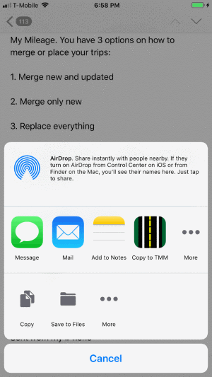 - Open the email and tap the attachment, then tap the "Copy to TMM" option.