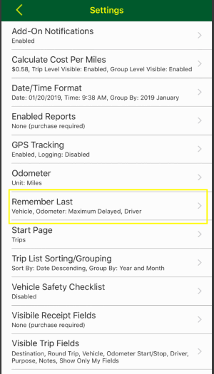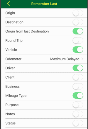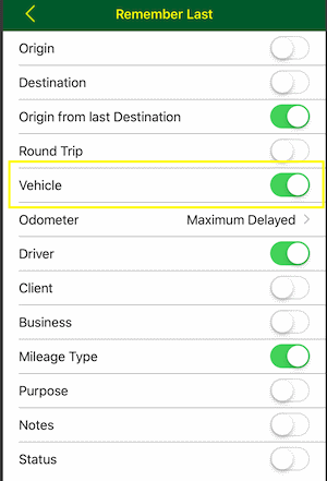 - Last Added Automatic: causes the app to automatically populate the odometer start with the last odometer stop value you added for the selected vehicle.