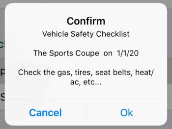 The checklist is your list of safety checks that should be performed on a daily basis. When the checklist is enabled, you will be prompted once per day for each vehicle to confirm you performed the safety checks and the Confirmed Checklist column with a yes or no value will the added to the exported report of your trips. To setup the checklist: