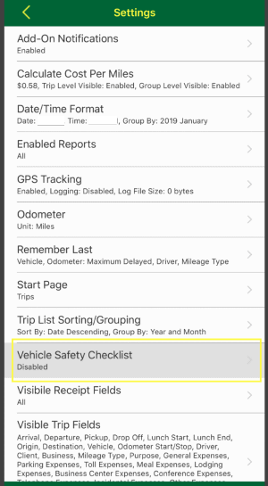 - Scroll down to and tap the "Vehicle Checklist" row.