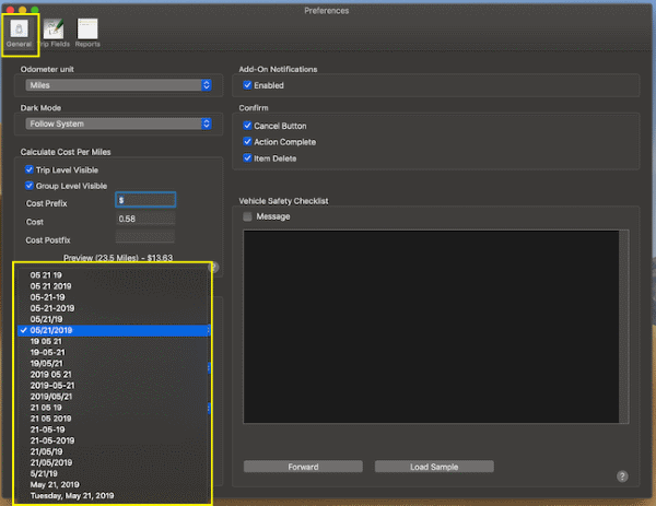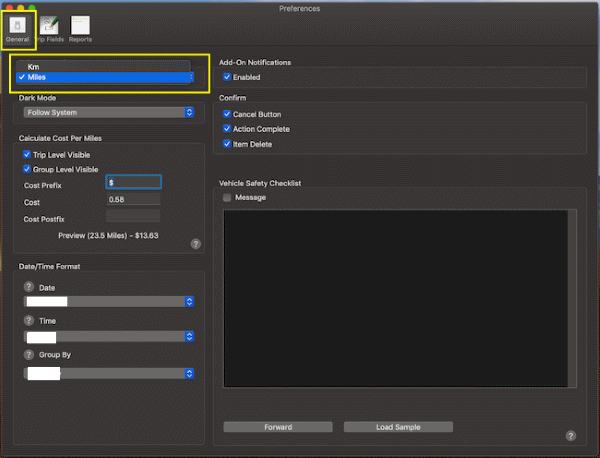 2. Click the General tab, then choose your preferred unit in the Odometer Unit popup list