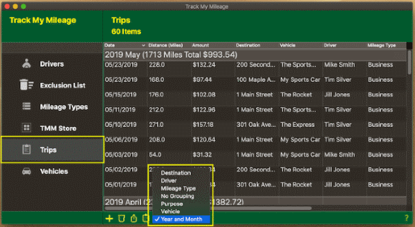 1. Click Trips, then click the button below the list of trips, then select the field you want to group the trips by.