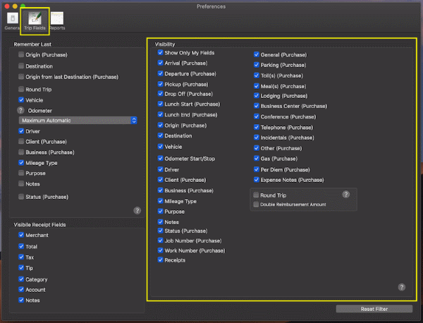 - Click the Trip Fields tab, to only show the fields that you have purchased, check the Show Only My Fields checkbox in the Visibility section. Unchecking show only my fields will require additional purchases to use the fields you do not own. For the fields you use, check the checkbox next to it. For the fields you don't use uncheck the checkbox next to it.